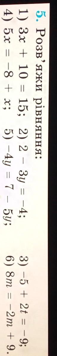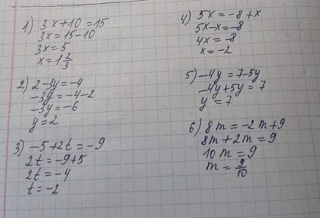 3) −5+ 2t = −9; 6) 8m = -2m + 9.