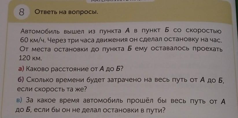 8 МАТЕМАТИКА В ЖИЗНИ Ответь на вопросы. Автомобиль вышел из пункта А в пункт Б со скоростью 60 км/ч. Через три часа движения он сделал остановку на час. От места остановки до пункта Б ему оставалось проехать 120 км. a) Каково расстояние от А до Б? 6) Сколько времени будет затрачено на весь путь от А до Б, если скорость та же? в) За какое время автомобиль прошёл бы весь путь от А до Б, если бы он не делал остановки в пути?