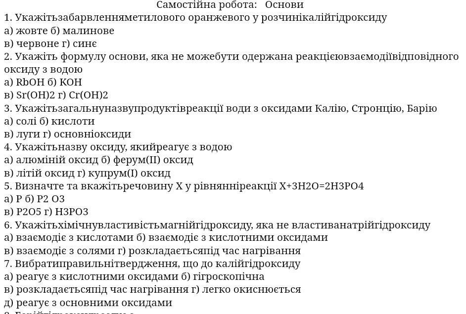 - (а) реагує з кислотними оксидами, (б) гігроскопічна, (д) реагує з основними оксидами.