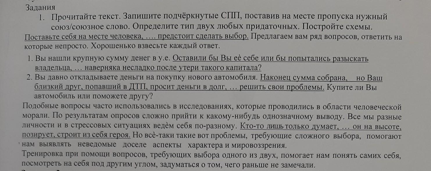 1. Прочитайте текст. Запишите подчёркнутые СПП, поставив на месте пропуска нужный союз/союзное слово. Определите тип двух любых придаточных. Постройте схемы.