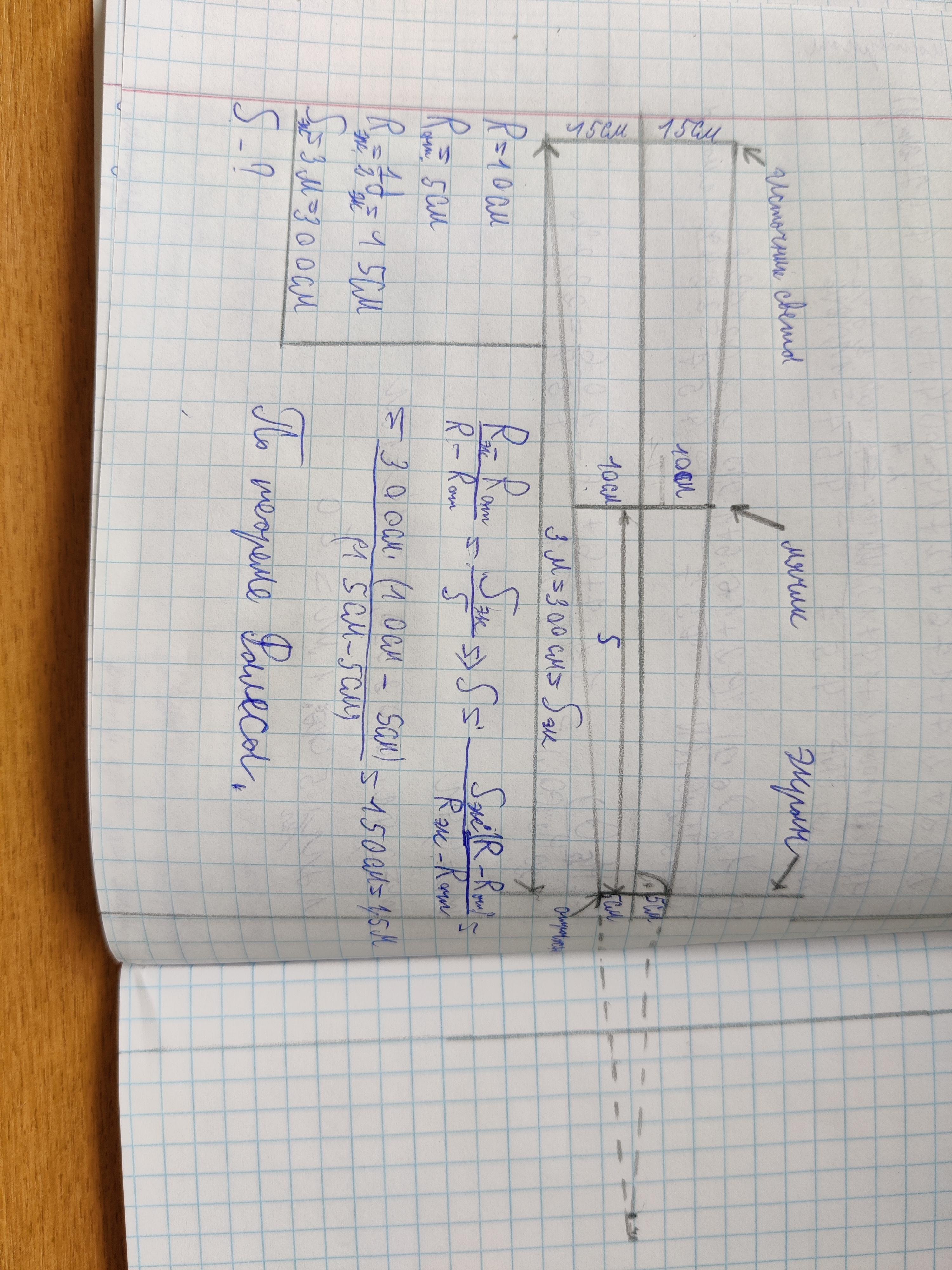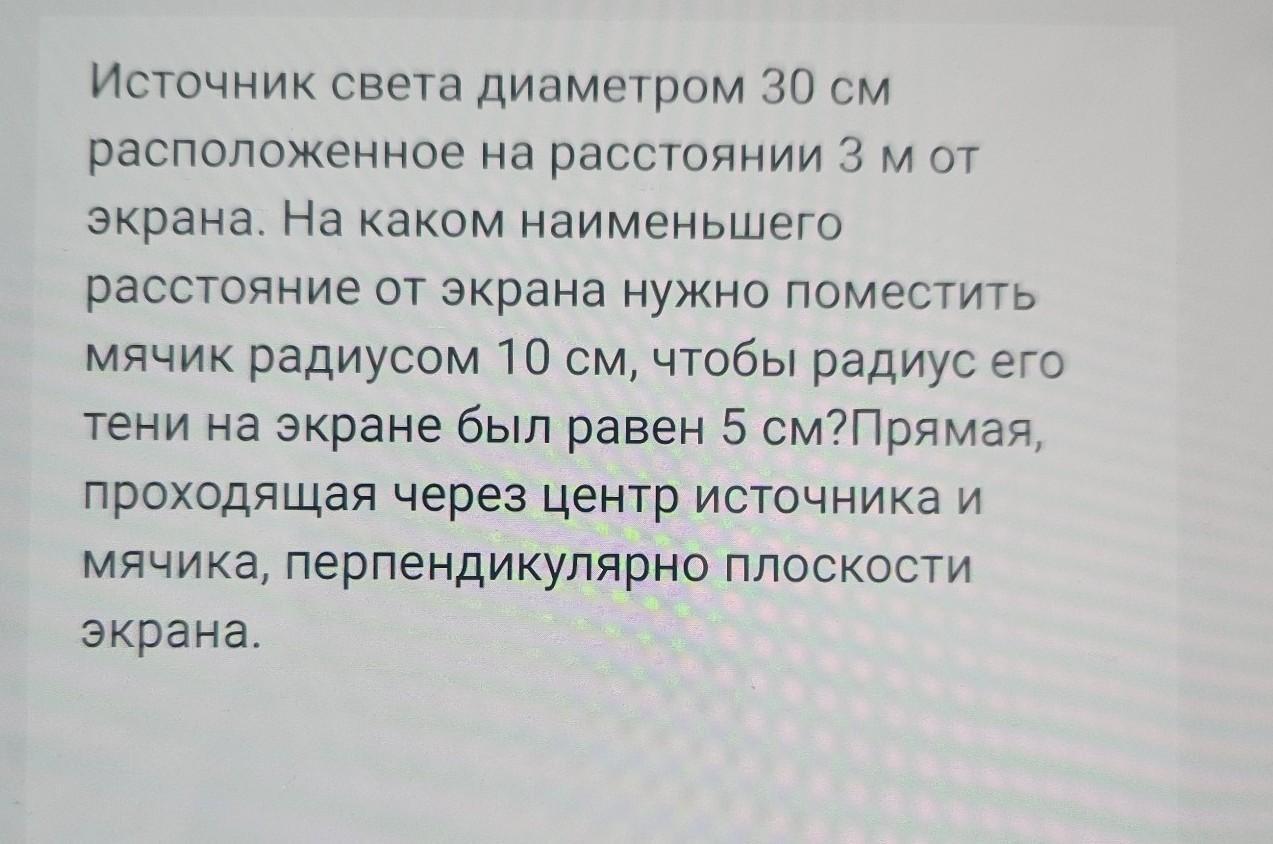 Объяснение: расстояние от экрана до источника света / на расстояние от мячика до экрана = радиусу ист. света - радиус отражения / на разность радиуса мяча и радиуса отражения. Sэк./Sм. = Rэк. - Rот./Rм. - Rот.