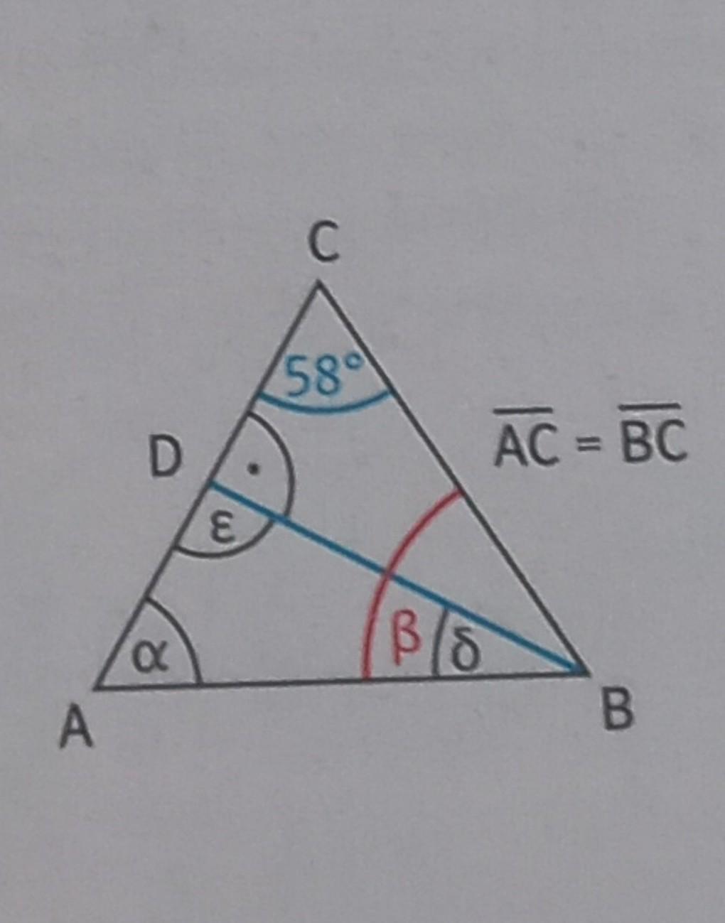 Угол A= углу В= (180-58)/2= 122/2= 61°