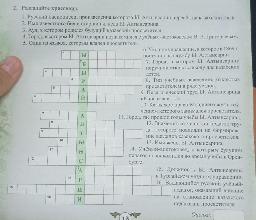 2. Разгадайте кроссворд. 1. Русский баснописец, произведения которого Ы. Алтынсарин перевёл на казахский язык. 2. Имя известного бия и старшины, деда Ы. Алтынсарина. 3. Аул, в котором родился будущий казахский просветитель. 4. Город, в котором Ы. Алтынсарин познакомился с учёным-востоковедом В. В. Григорьевым. 5. Один из языков, которым владел просветитель. 15 6 12 3 7 9 5 8 11 16 1 10 4 14 Ы 2 Б Ы Те P A Й A Л T Ы H 13 A P И Н 6. Уездное управление, в которое в 1869 г. поступил на службу Ы. Алтынсарин. 7. Город, в котором Ы. Алтынсарину поручили открыть школу для казахских детей. 8. Тип учебных заведений, открытых просветителем в ряде уездов. 9. Педагогический труд Ы. Алтынсарина «Киргизская ...». 10. Казахское право Младшего жуза, изу- чением которого занимался просветитель. 11. Город, где прошли годы учёбы Ы. Алтынсарина. 12. Знаменитый чешский педагог, тру- ды которого повлияли на формирова- ние взглядов казахского просветителя. 13. Имя жены Ы. Алтынсарина. 14. Учёный-востоковед, с которым будущий педагог познакомился во время учёбы в Орен- бурге. 15. Должность Ы. Алтынсарина в Тургайском уездном управлении. 16. Выдающийся русский учёный- педагог, оказавший влияние на становление казахского педагога и просветителя. Оценка: