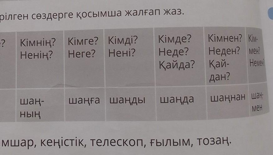 ә) Берілген сөздерге қосымша жалғап жаз. Кiмде? Кiм? Не? Кiмнiң? Кімге? Кімді? Ненің? Неге? Нені? неде? Қайда? Кай- дан? шаң шаң- шаңға шаңды ның шаңда Кімнен? Кім- неден? мен? Немен? шаңнан шаң- мен Ғаламшар, кеңістік, телескоп, ғылым, тозаң. пж 100 бал