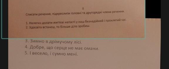 1. Нелегко долати (присудок, двома лініями) життєві(означення, хвилястою) напасті(додаток, пунктиром) у наш(означення, хвилястою) безнадійний(означення, хвилястою) і проклятий(означення, хвилястою) час (обставина, крапка-тире).