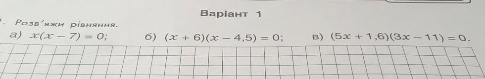 1. Розв'яжи рiвняння. a) x(x - 7) = 0; б) (x + 6)(x - 4,5) = 0; B) (5x+1,6)(3x-11)=0.
