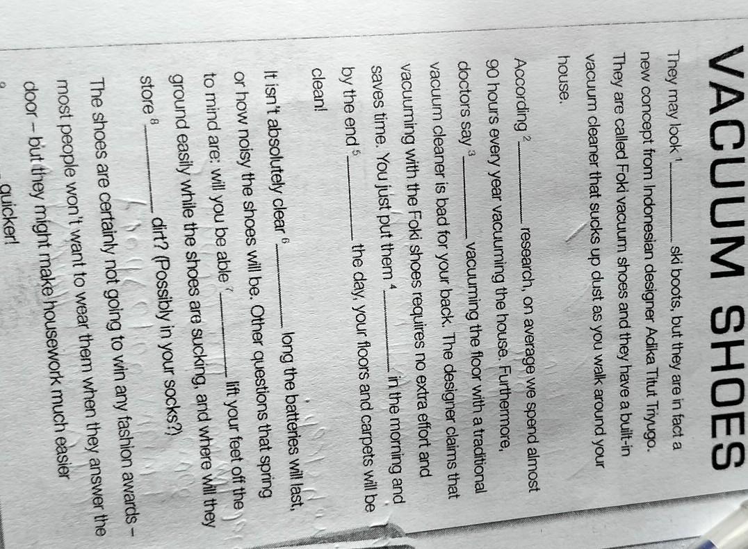 Відповідь: They may look like ski boots, but they are in fact a new concept from Indonesian designer Adika Titut Triyugo. They are called Foki vacuum shoes and they have a built-in vacuum cleaner that sucks up dust as you walk around your house.