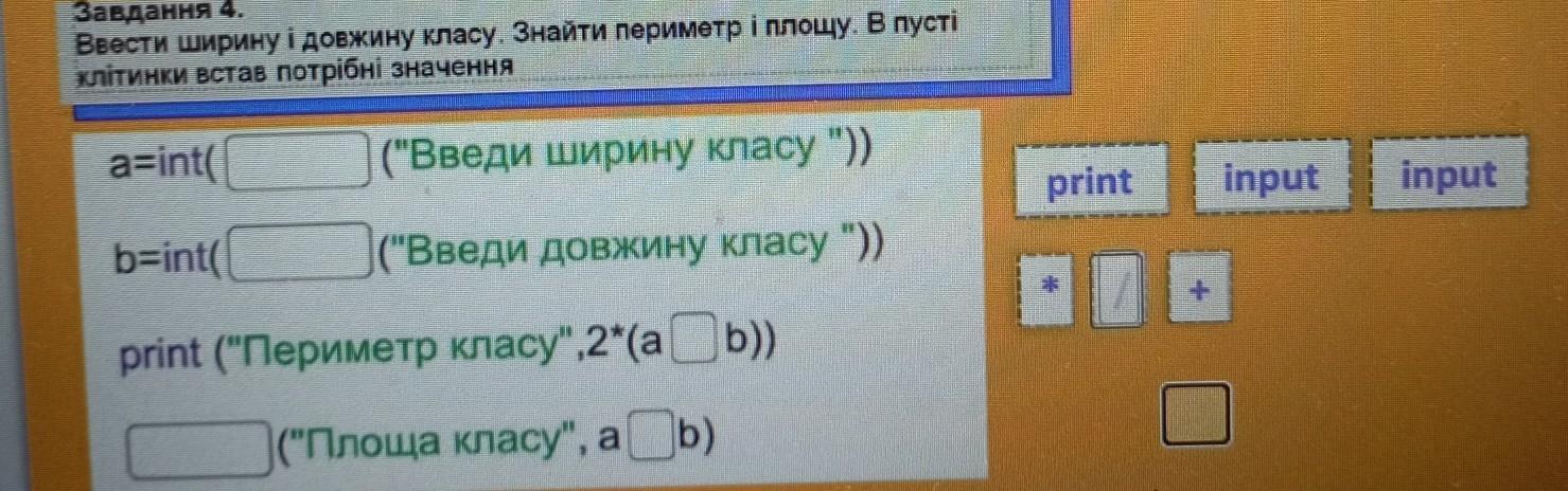 Ввести ширину і довжину класу. Знайти периметр і площу. В пусті клітинки встав потрiбнi значення