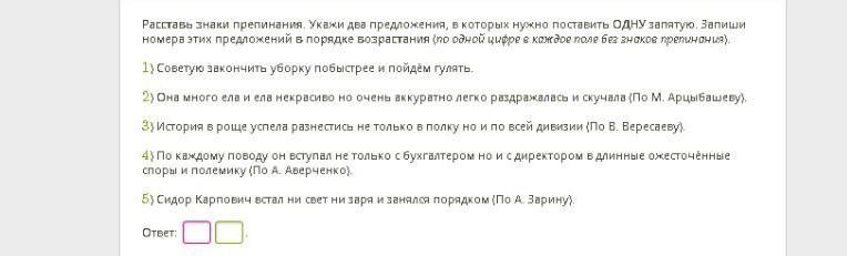 Расставь знаки препинания. Укажи два предложения, в которых нужно поставить одну запятую. Запиши номера этих предложений в порядке возрастания (по одной цифре в каждое поле без знаков препинания). 2 Б. 1) Советую закончить уборку побыстрее и пойдём гулять. 2)Она много ела и ела некрасиво но очень аккуратно легко раздражалась и скучала (По М. Арцыбашеву), 3) История в роще успела разнестись не только в полку но и по всей дивизии (По В. Вересаеву) 4)По каждому поводу он вступал не только с бухгалтером но и с директором в длинные ожесточенные споры и полемику (По А. Аверченко). 5) Сидор Карпович встал ни свет ни заря и занялся порядком (По А. Зарину). Ответ: