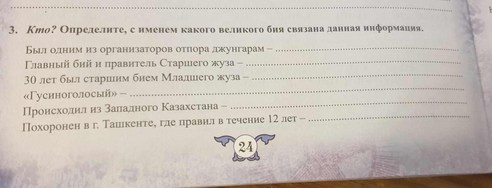 ДАМ 25 БАЛЛОВ 3. Кто? Определите, с именем какого великого бия связана данная информация. Был одним из организаторов отпора джунгарам - Главный бий и правитель Старшего жуза - 30 лет был старшим бием Младшего жуза -.. «Гусиноголосый» - Происходил из Западного Казахстана - Похоронен в г. Ташкенте, где правил в течение 12 лет 24