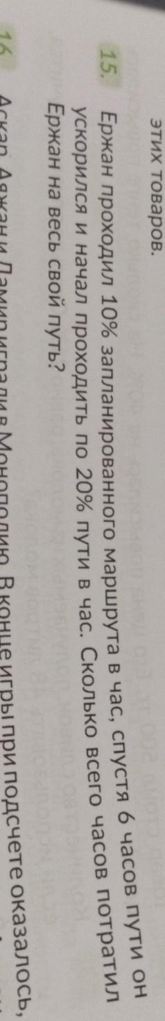 СРОЧНО! Ержан проходил 10% запланированного маршрута в час, спустя 6 часов пути он ускорился и начал проходить по 20% пути в час, сколько всего часов потратил Ержан на весь свой путь?