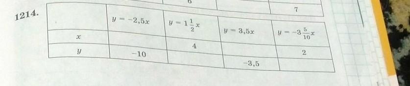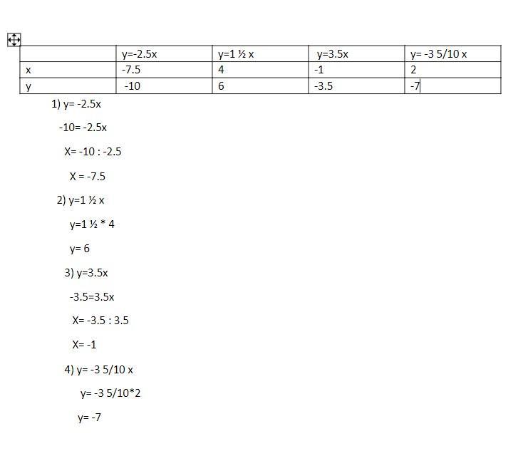 y заполни таблицу и построй графики y y=-2,5x -10 6 y = 1 1/2 x 4 -2 y = 3,5x -3,5 7 y=-3-2x 10 2