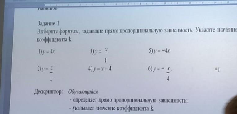 31 3 Задание 1 Выберите формулы, задающие прямо пропорциональную зависимость. Укажите значение коэффициента к 1) y = 4x 2)y=4 X 3)y= x 4 4)y=x+4 Дескриптор: Обучающийся 5)y=-4x 6)y=-x. 4 - определяет прямо пропорциональную зависимость: - указывает значение коэффициента к ДАЮ 100 БАЛЛОВ СРОЧНО