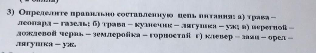 б) трава - кузнечик-лягушка-уж; в) перегной- дождевой червь - землеройка - горностай