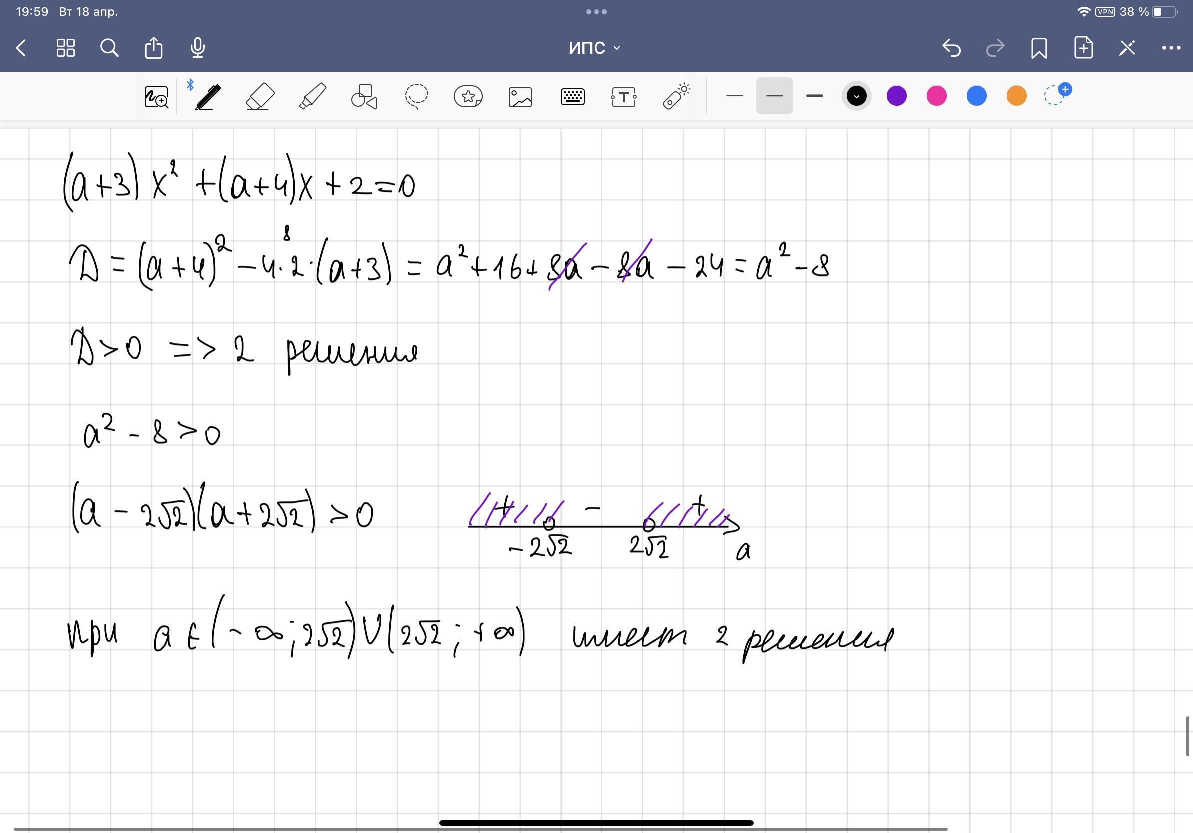 Найдите все значения числа а, при которых уравнение (a + 3)x2 + (a + 4)x + 2 = 0 имеет два корня.