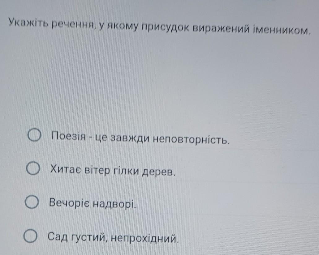 Укажіть речення, у якому присудок виражений іменником. о Поезія - це завжди неповторність. о Хитає вітер гілки дерев. о вечоріє надворі. о Сад густий, непрохідний. ОЧЕНЬ СРОЧНО