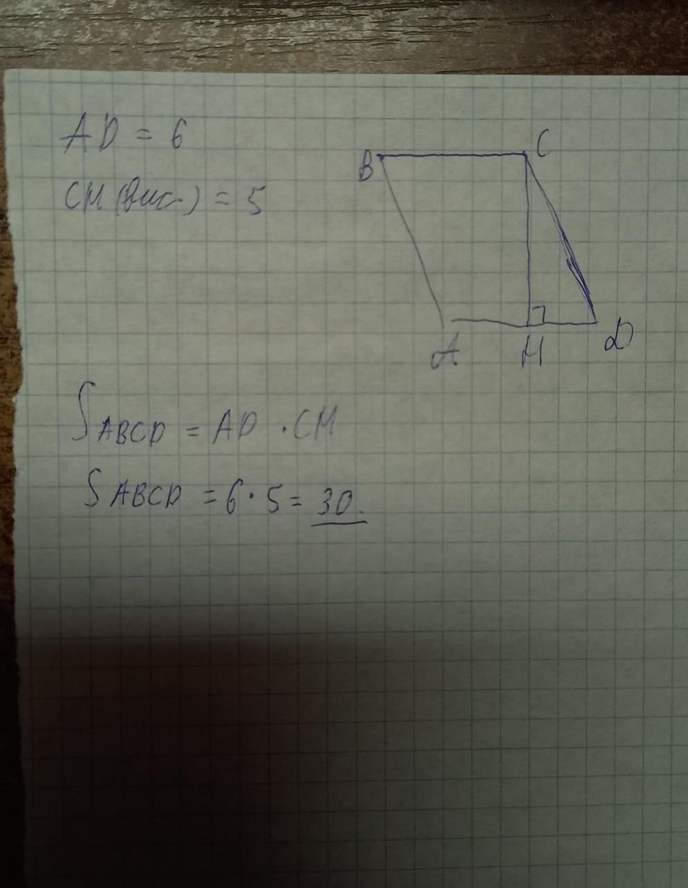 Знайдіть площу паралелограма, одна з висот якого дорівнює 6 см, а сторона до якої вона проведена-5 см