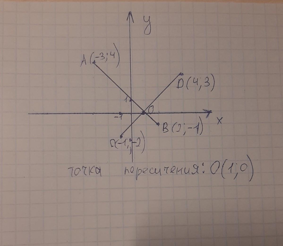 1. Построить отрезки AB и CD и найти координаты их точки пересечения, если А(-3:4), В(2;-1), C(-1;-2), D (4:3).