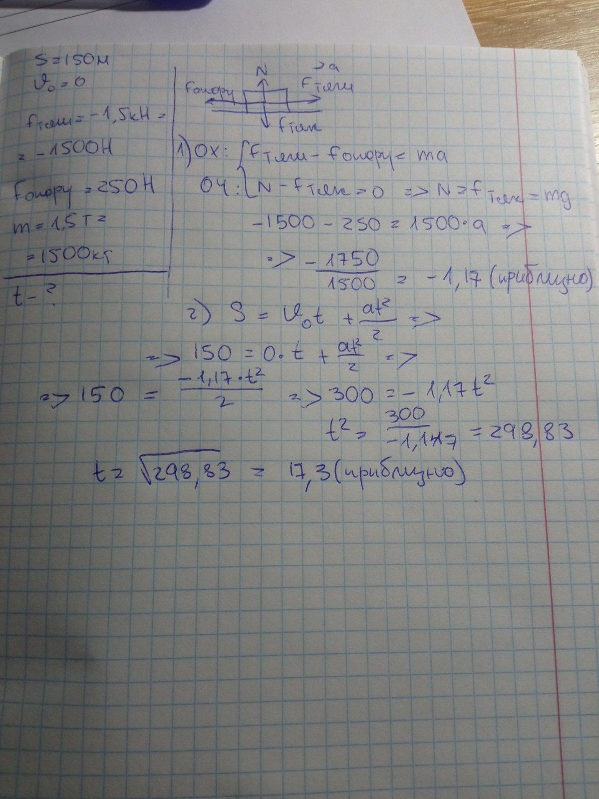2.За який час автомобіль проїде 150 м, якщо його початкова швидкість дорівнює нулю, сила тяги - 1,5 кН, а силу опору дорівнює 250 Н? Маса автомобіля • 1,5 т.