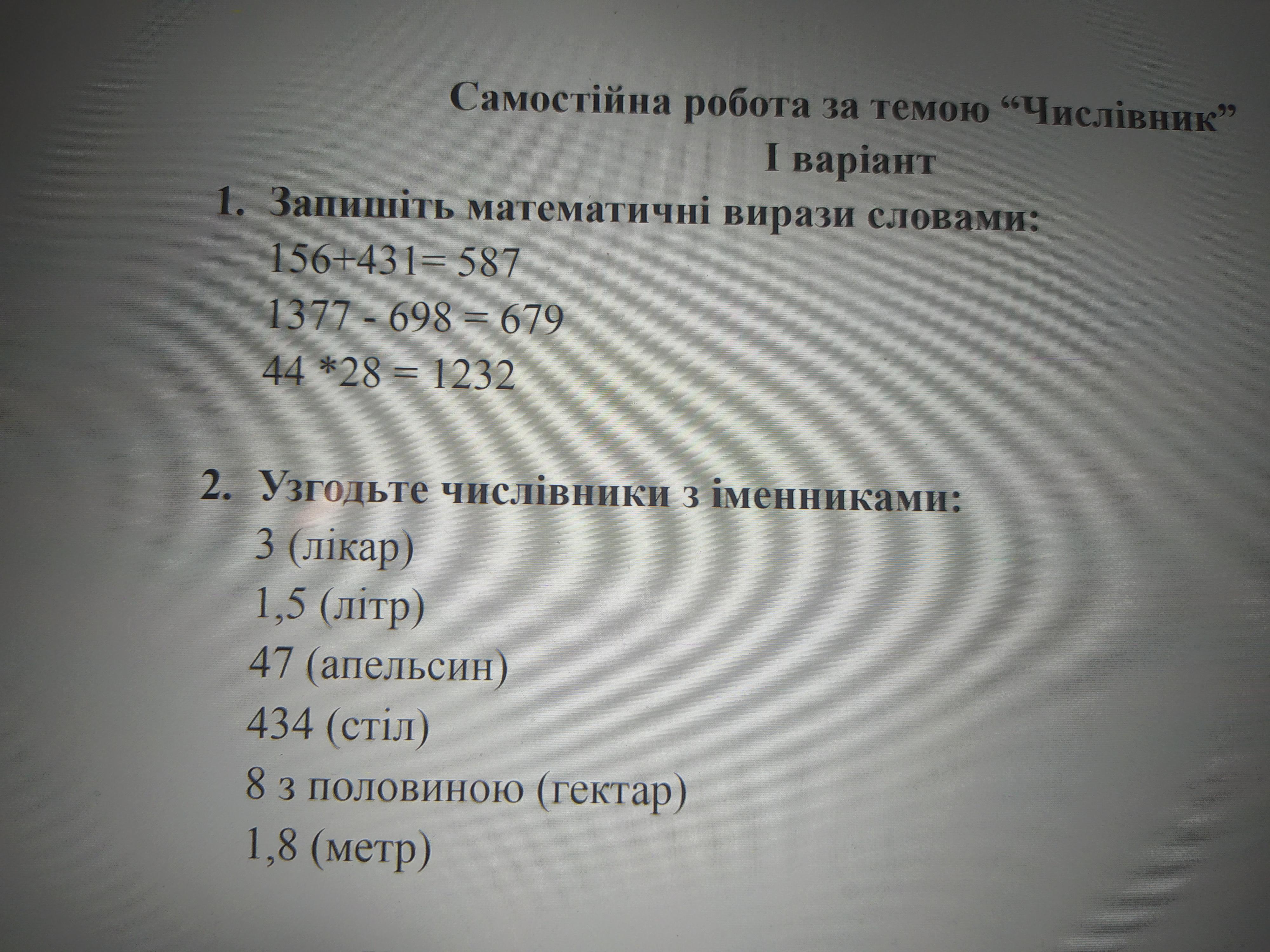 1.Сто п'ядесят шість плюс чотириста тридцять один дорівнює п'ятсот вісімдесят сім.