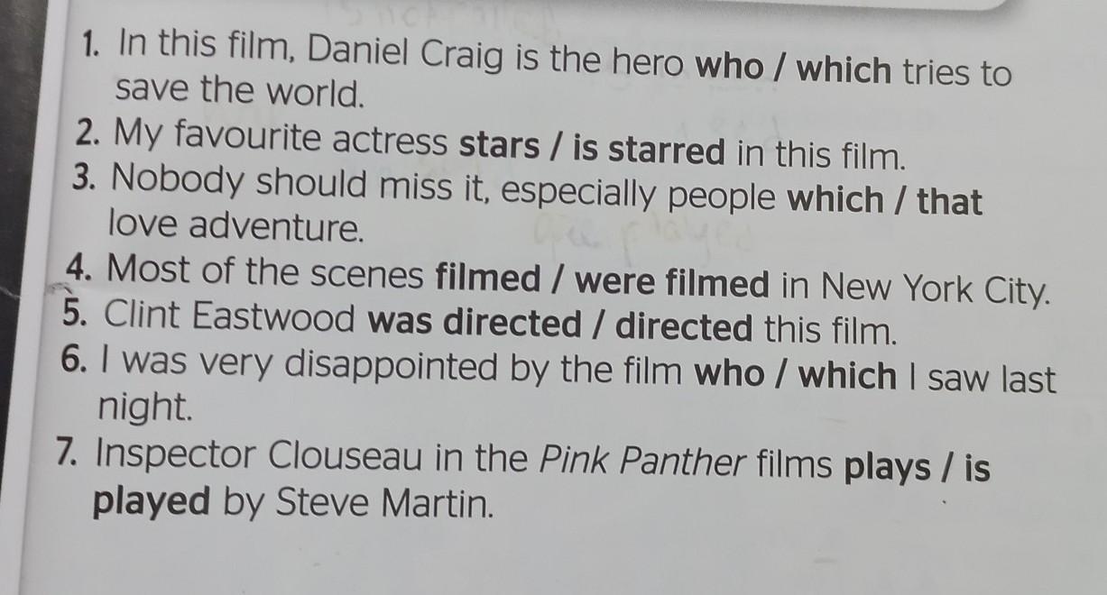 1. In this film, Daniel Craig is the hero who / which tries to save the world. 2. My favourite actress stars / is starred in this film. 3. Nobody should miss it, especially people which/ that love adventure. 4. Most of the scenes filmed / were filmed in New York City. 5. Clint Eastwood was directed / directed this film. 6. I was very disappointed by the film who / which I saw last night. 7. Inspector Clouseau in the Pink Panther films plays / is played by Steve Martin.