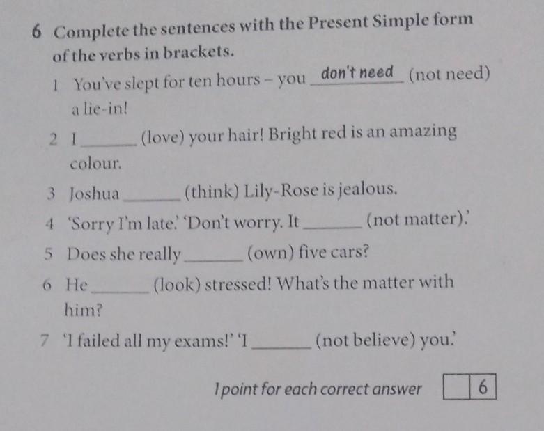 Ответ:2.loves 3.thinks 4.doesn’t matter 5.owns 6.looks 7.don’t believe