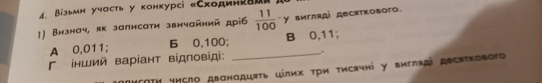 4. Вiзьми участь у конкурсі «Сходинками до математи 11 1) Визнач, як записати звичайний дріб у вигляд деся 100 в 0,11; A 0,011; Б 0,100; Г iнший варіант відповіді: