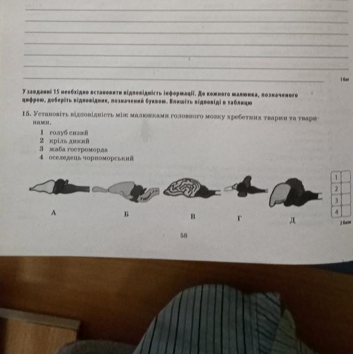 Установіть відповідність між малюнками головного мозку хребетних тварин та тваринами.(фото)