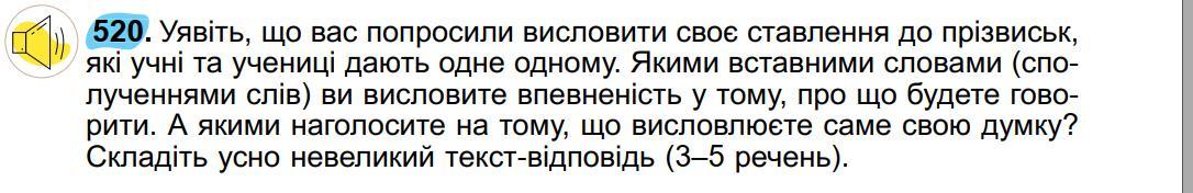 Уявіть, що вас попросили висловити своє ставлення до прізвиськ, які учні та учениці дають одне одному. Якими вставними словами (сполученнями слів) ви висловите впевненість у тому, про що будете говорити. А якими наголосите на тому, що висловлюєте саме свою думку? Складіть усно невеликий текст-відповідь (3-5 речень). Я вважаю, що вживання прізвиськ у колі спілкування навіть близьких друзів — це неприпустимо. По-перше, прізвиська — це демонстрація низької культури виховання. По-друге, прізвисько знецінює ім’я, дане нам батьками, а значить, принижує їх. По-третє, прізвисько — це те саме, що кличка для тварини. Але ж людина — істота мисляча. Тож давайте залишатися людьми й обходитися без цієї ганебної звички.