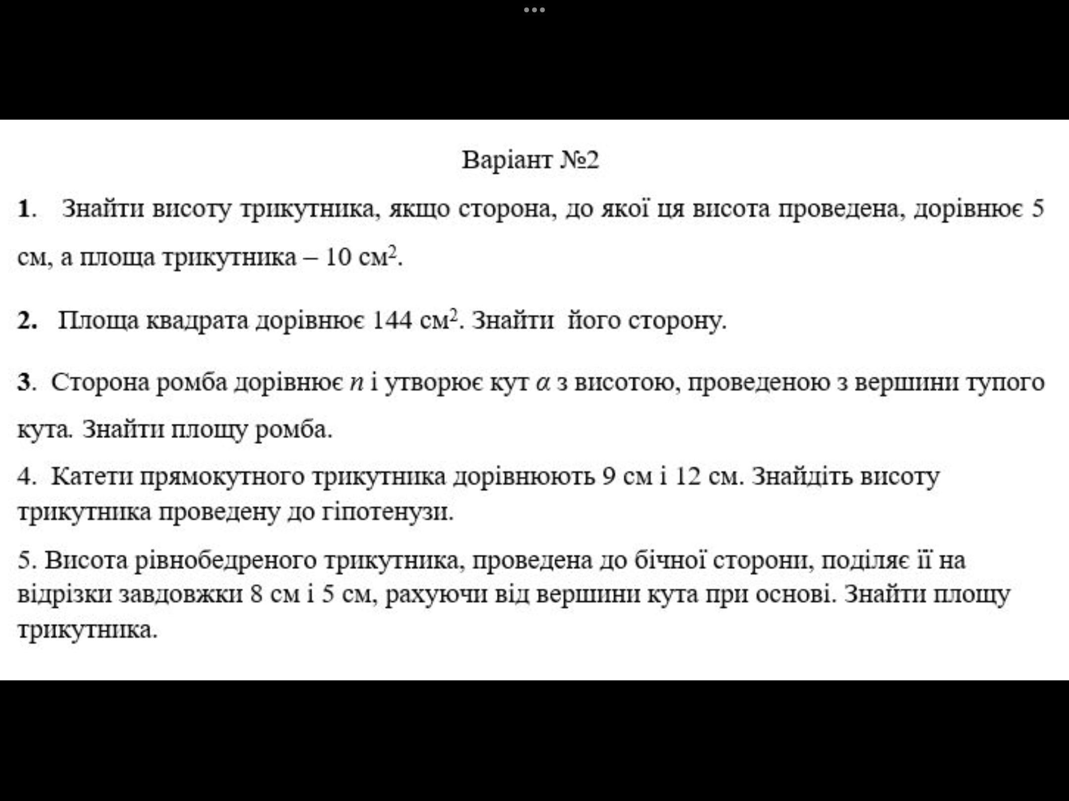 1. Використовуючи формулу площі трикутника S = 0.5 a h, де a - сторона, до якої проведена висота, а h - висота, можна знайти висоту трикутника: h = 2 S / a. Підставляючи відомі значення, отримаємо h = 2 10 / 5 = 4 см.