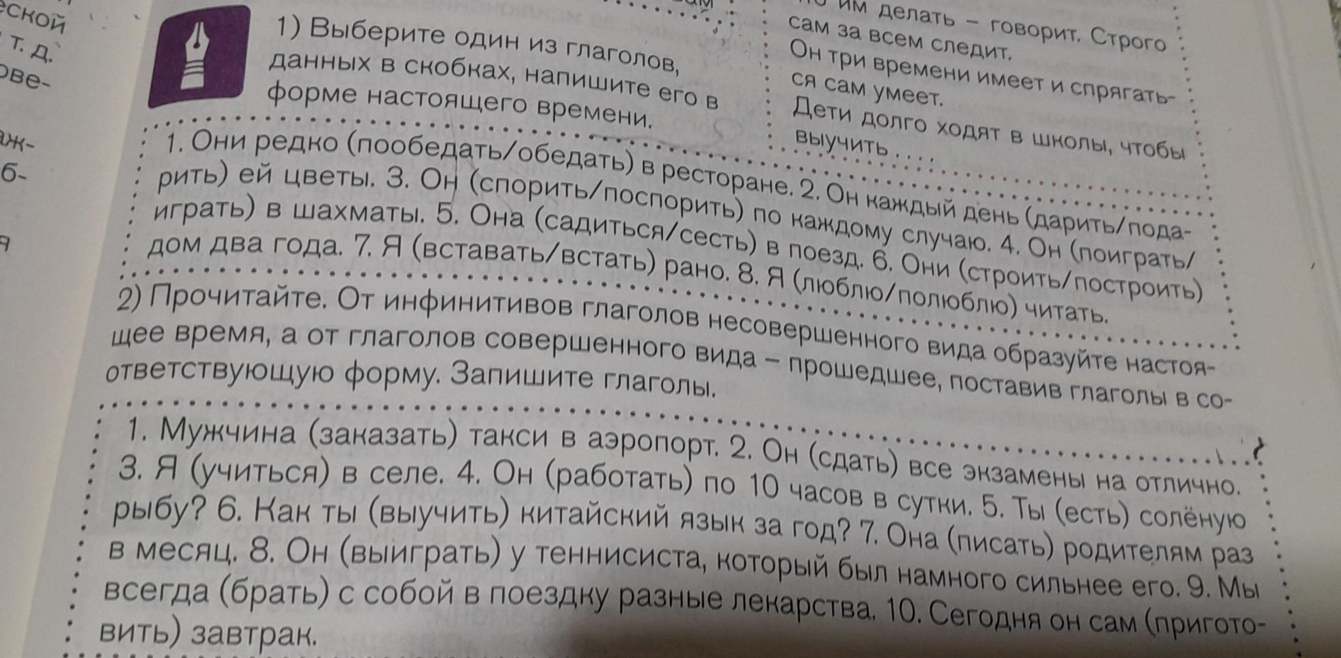 2. Мужчина заказал такси в аэропорт. Он слал все экзамены на отлично. Я буду учиться в селе. Он будет работать по 10 часов в сутки. Ты будешь есть солёную рыбу? Как ты выучил китайский язык за год? Она писала родителям раз в месяц. Он выигрывал у теннисиста, который был намного сильнее его. Мы всегда будем брать с собой в поездку разные лекарства. Сегодня он сам приготовил завтрак.