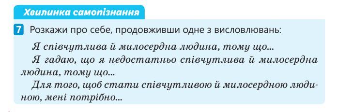 Я співчутлива й милосердна людина, тому що я завжди стараюся підтримувати і допомагати людям, коли вони потребують допомоги. Я переживаю за інших і намагаюсь бути терплячим та розуміючим у будь-яких ситуаціях. Я вважаю, що якщо я можу допомогти комусь, то я повинен це зробити, і це допомагає мені відчувати себе корисним та задоволеним.