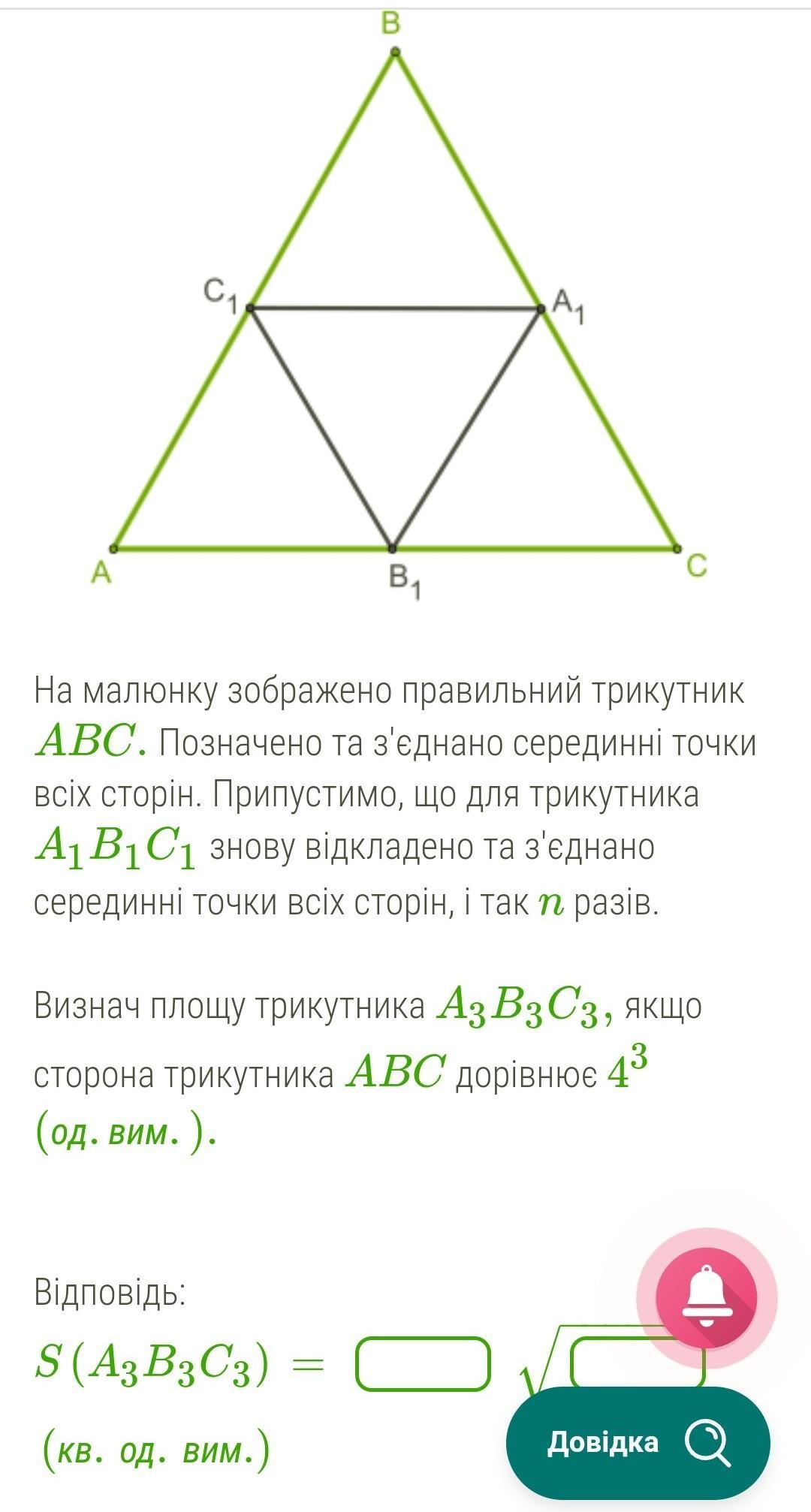 На малюнку зображено правильний трикутник ABC. Позначено та з'єднано серединні точки всіх сторін. Припустимо, що для трикутника A1B1C1 знову відкладено та з'єднано серединні точки всіх сторін, і так n разів. Визнач площу трикутника A3B3C3, якщо сторона трикутника ABC дорівнює 43 (од.вим.). Відповідь: S(A3B3C3)= −−−−−−−√(кв.од.вим.).
