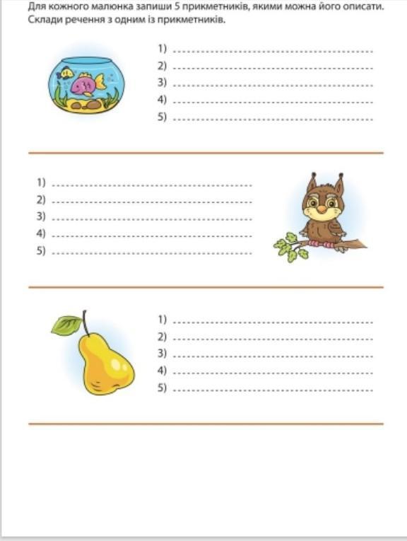 Для кожного малюнка запиши 5 прикметників, якими можна його описати. Склади речення з одним із прикметників.