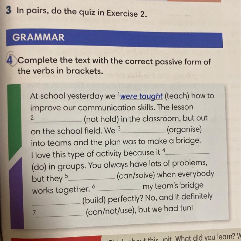At school yesterday we were taught how to improve our communication skills. The lesson was not held in the classroom, but out on the school field. We were organised into teams and the plan was to make a bridge.