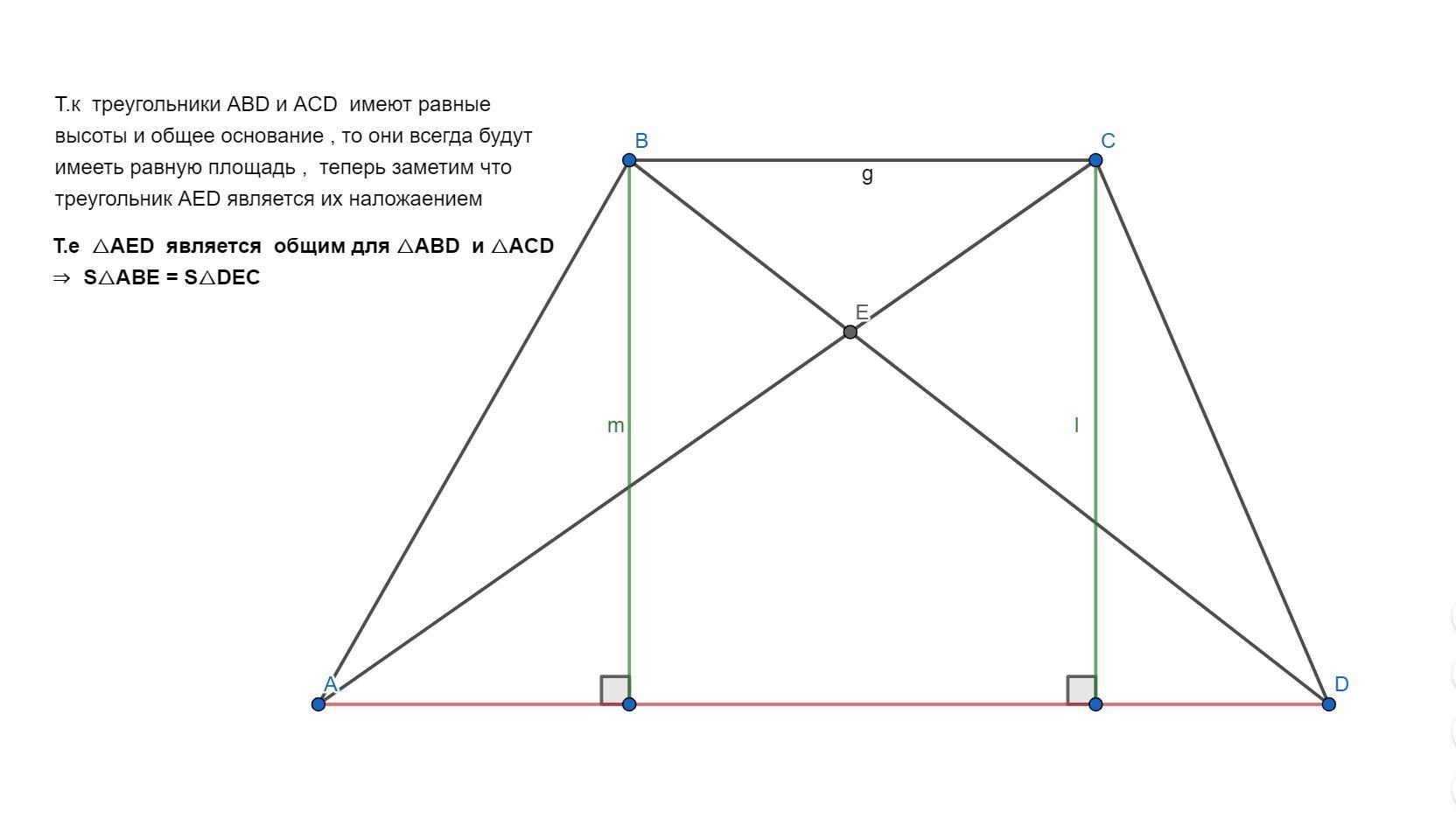 Поскольку нам дана трапеция , то треугольники ABE и DEC имеют равную площадь , и т.к ∠BEA = ∠ CEA как вертикальные