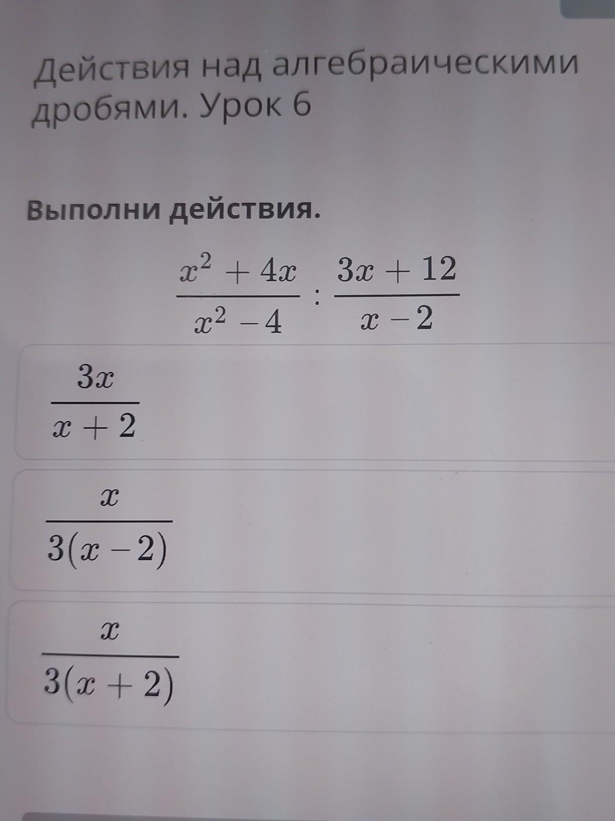Выполни действия. x² + 4x x2 - 4 3x x + 2 X 3(x - 2) X 3(x + 2) : 3x + 12 x-2 вып деле Пре в в ду Mn. дам 40б