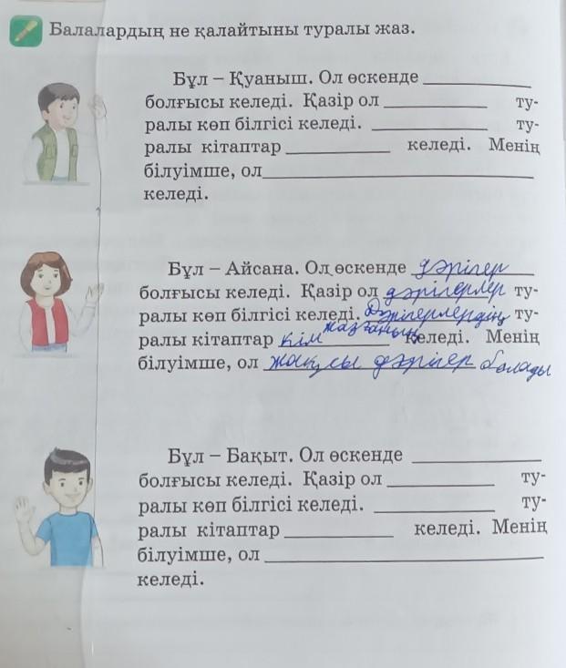 Балалардың не қалайтыны туралы жаз. Бұл - Қуаныш. Ол өскенде болғысы келеді. Қазір ол ралы көп білгісі келеді. ралы кітаптар білуімше, ол келеді. Бұл - Айсана. Ол өскенде - болғысы келеді. Қазір ол ралы көп білгісі келеді. ралы кітаптар білуімше, ол Бұл - Бақыт. Ол өскенде - болғысы келеді. Қазір ол ралы көп білгісі келеді. ралы кітаптар білуімше, ол келеді. ту- ту- келеді. Менің ту- ту- келеді. Менің ту- ту- келеді. Менің