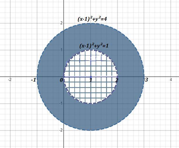 Значит заданная область - это кольцо между окружностями с центром в точке (1;0) и радиусами R₁=1 и R₂=2 . Причём сами окружности в область не входят, так как знак неравенства строгий. И поэтому окружности рисуем пунктирными линиями .