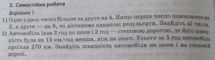 Якщо перше число помножити на 2, то результат буде дорівнювати другому числу помноженому на 6. Скоротимо обидва множники на 2. Маємо: перше число дорівнює потроєному другому числу. Також відомо, що перше число на 4 більше за друге число. Поєднаємо ці дві умови. Маємо: якщо до другого числа додати 4, то результат буде дорівнювати потроєному другому числу. Відповідно: подвоєнне друге число дорівнює 4. Друге число дорівнює 2. А перше число дорівнює 6 ( 2 + 4 = 6 ).