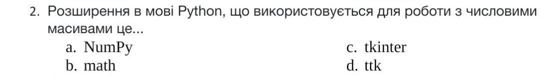 Розширення NumPy використовується для роботи з числовими масивами в мові Python.