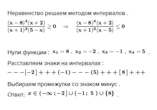 Выбираем промежутки со знаком минус . Ещё включается в решение число 8 , так как знак неравенства не строгий и при х=8 дробь рана 0 .
