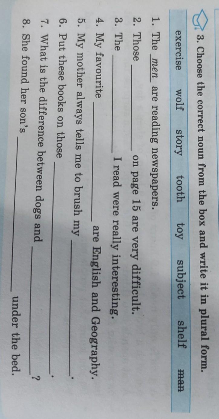 3. Choose the correct noun from the box and write it in plural form. exercise wolf story tooth toy subject shelf man 1. The men are reading newspapers. 2. Those on page 15 are very difficult. I read were really interesting. 3. The 4. My favourite 5. My mother always tells me to brush my 6. Put these books on those 7. What is the difference between dogs and 8. She found her son's are English and Geography. ? under the bed.