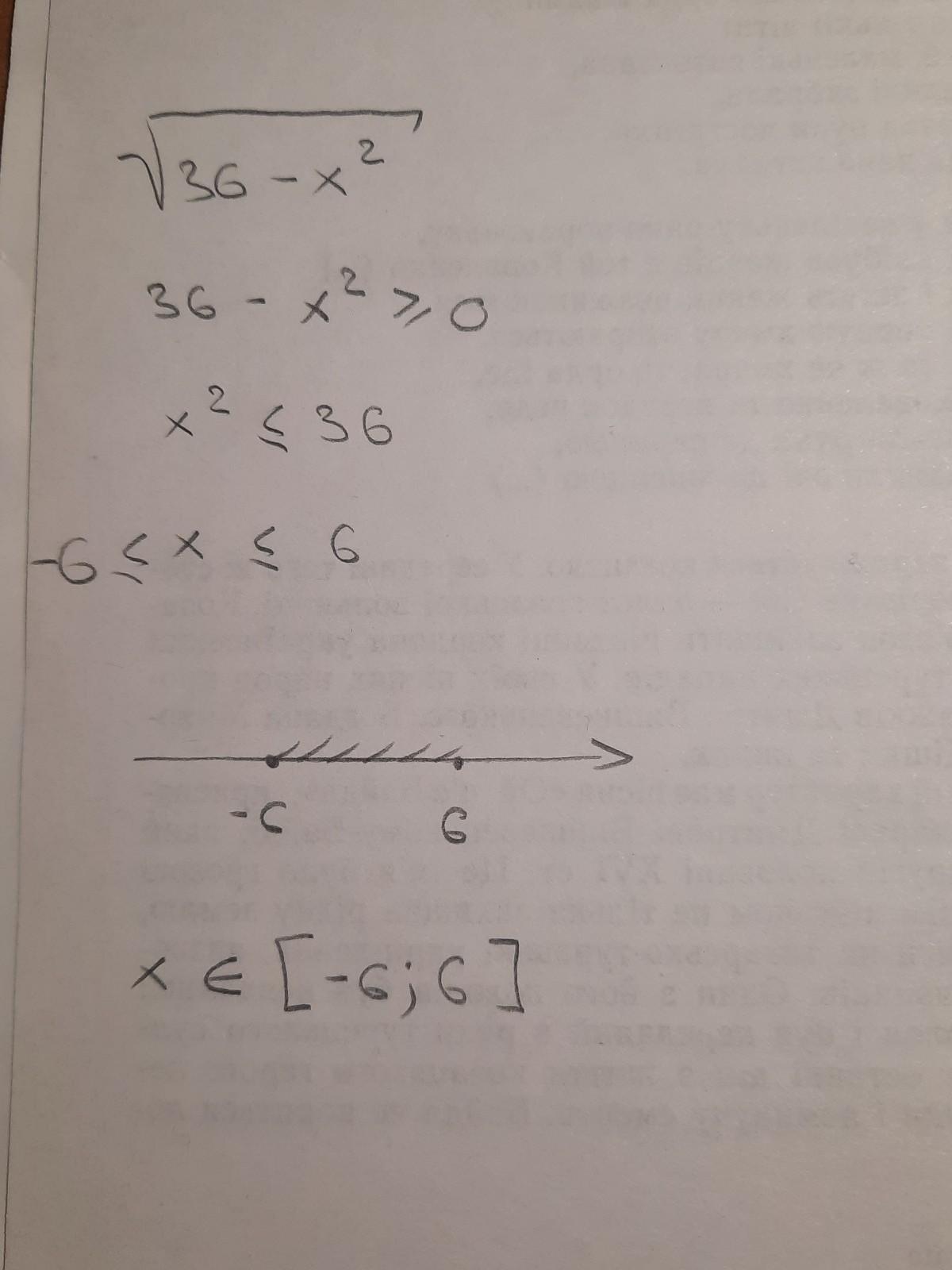 підкореневий вираз повинен бути більшим або дорівнявати нулю. Записуємо це, розв'ящуємо нерівність, отримали що х від -6 до 6 позначаеми на прямій і записуємо відповідь, як прказано на фото