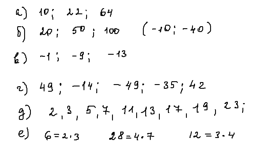 запишите несколько чисел :а)чётных положительных ;б)чётных и кратких 5;в)нечётных отрицательных ;г)нечётных и кратких7;д)простых и меньших 30;е)составных и чётных