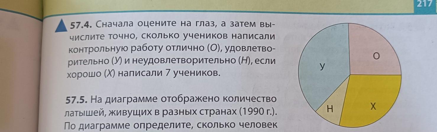 57.4. Сначала оцените на глаз, а затем вы- числите точно, сколько учеников написали контрольную работу отлично (О), удовлетво- рительно (У) и неудовлетворительно (Н), если хорошо (X) написали 7 учеников.