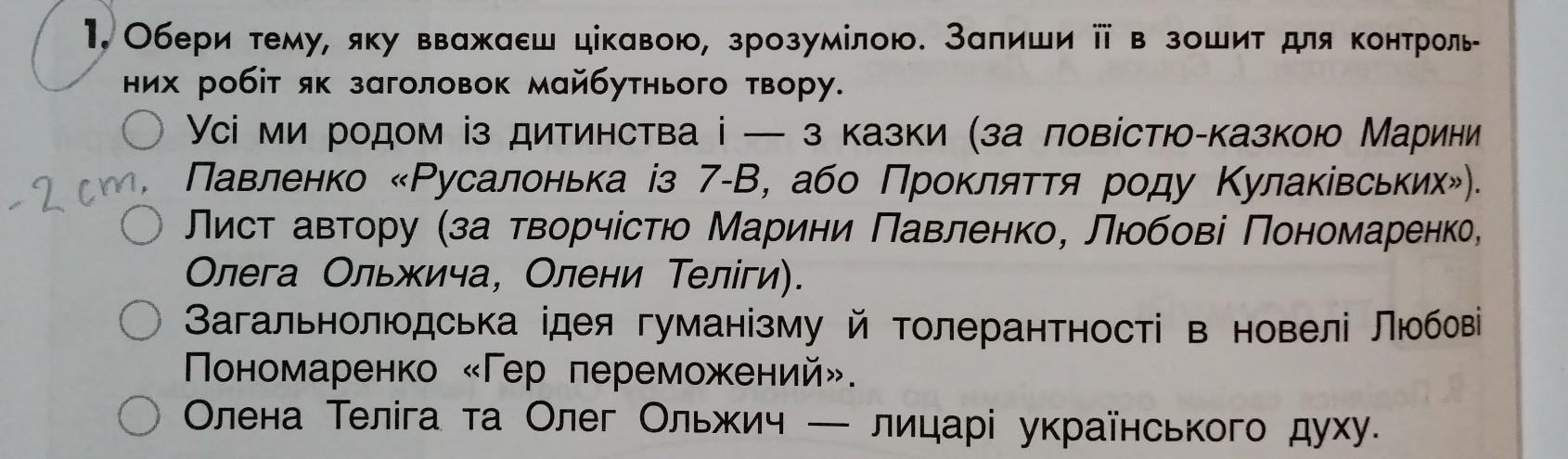 1. Обери тему, яку вважаєш цікавою, зрозумілою. Запиши її в зошит для контроль- них робіт як заголовок майбутнього твору. Усі ми родом із дитинства і — з казки (за повістю-казкою Марини 5-2 см. Павленко «Русалонька із 7-В, або Прокляття роду Кулаківських»). Лист автору (за творчістю Марини Павленко, Любові Пономаренко, Олега Ольжича, Олени Теліги). Загальнолюдська ідея гуманізму й толерантності в новелі Любові Пономаренко «Гер переможений». Олена Теліга та Олег Ольжич лицарі українського духу.