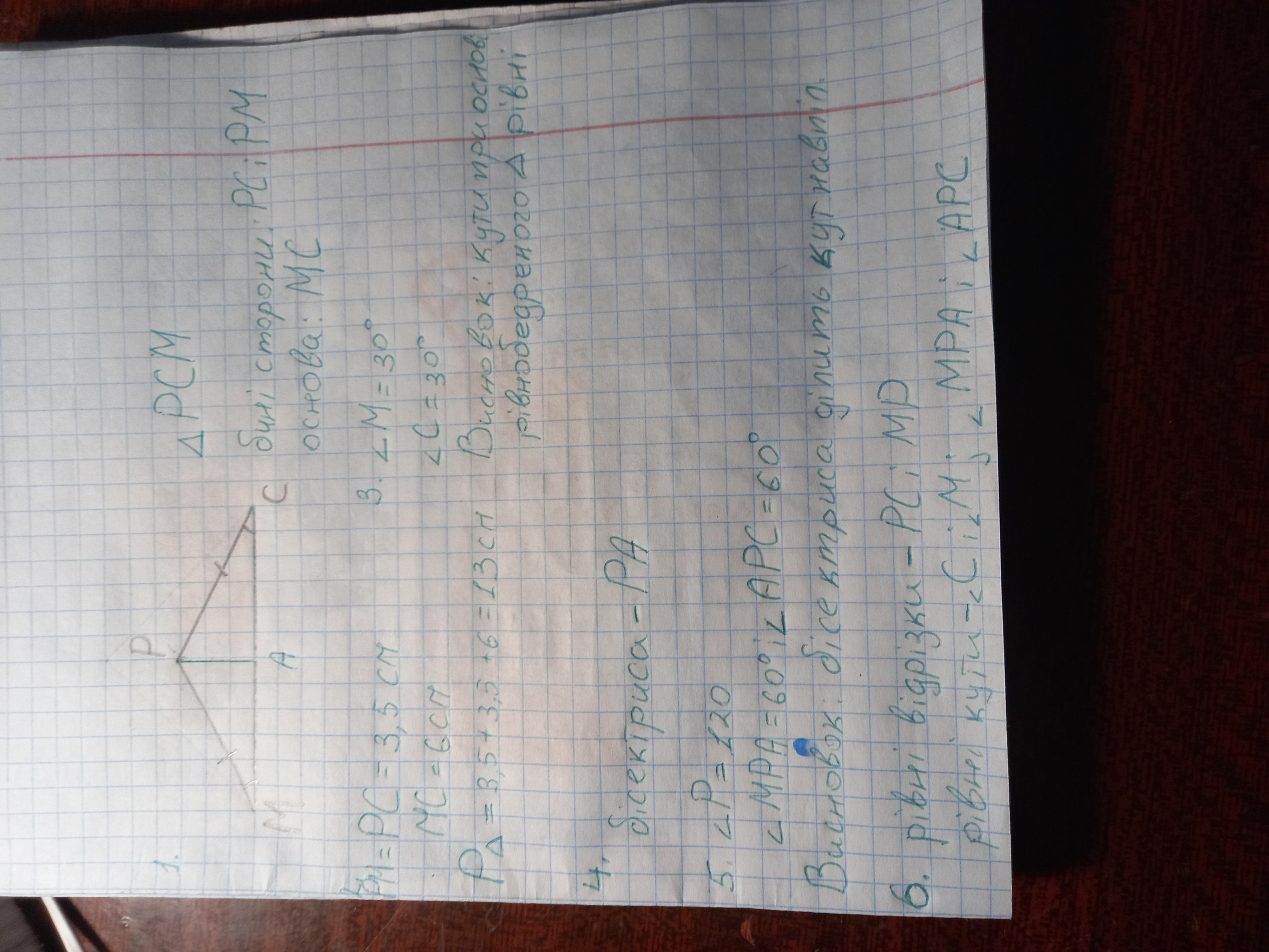 6. Знайти та виписати рівні відрізки та кути, що утворились та поясніть їх рівність за властивістю бісектриси рівнобедреного трикутника. Виконайте відповідні вимірювання та дії.