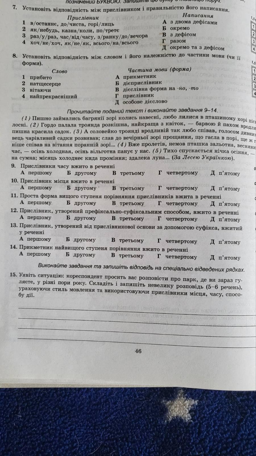 15.Я гуляю в парку біля мого будинку кожного дня. Весною, коли все зацвітає, це місце стає особливо привабливим. Літом, я люблю прогулюватися по парковій алеї, де є багато дерев, які надають прохолоди. Восени, коли листя починає змінювати колір, цей парк виглядає неймовірно красиво. А взимку, коли все замерзає, парк перетворюється в зимову казку зі своїми гілками облитими снігом та замерзлими струмочками. Цей парк - моє улюблене місце для прогулянок в будь-яку пору року.