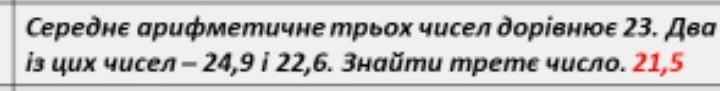 Середнє арифметичне трьох чисел дорiвнює 23. Два iз цих чисел -24,9 і 22,6. Знайти треме число. 21,5